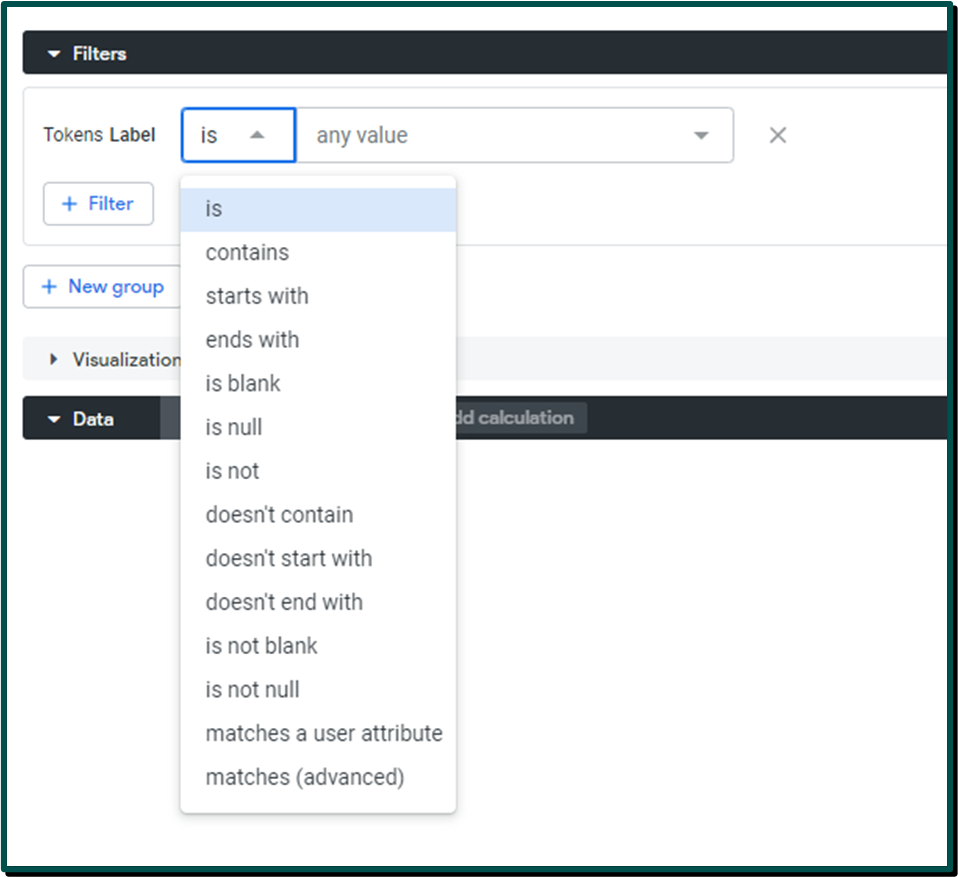 <table><thead><tr><th width="234">"Any Value" Operator </th><th>Definition</th></tr></thead><tbody><tr><td><strong>is</strong></td><td><p>Only results containing that specific value will be displayed. "is" is more specific than "contains". </p><p></p><p>E.g. Filtering on a "Label" that "is" "terrorists" will exclude results that contain "terrorists" and another label such as "hamas" and will also exclude singular versions of the "Label" such as "terrorist".                                                                                                   </p><p></p><p>The "is" operator is especially useful for filtering on specific blockchain addresses where the exact address you want included is known. </p></td></tr><tr><td><strong>contains</strong> </td><td><p>The user specified input is part of the result.  </p><p></p><p>E.g. Using a filter on "Labels" that "contains" "terrorist" will display all results that have the text "terrorist", and also results that have the text "terrorists" (the plural and singular are treated as equal). </p><p></p><p>E.g. Using a "contains" filter on a blockchain address, for example where you only have the middle few characters of a blockchain address, will display all of the blockchain addresses that have these few characters in any part of the address.  </p></td></tr><tr><td><strong>starts with</strong></td><td><p>The result begins with the user input. </p><p></p><p>The operator "starts with" is especially useful for filtering blockchain addresses where you only have the first few characters (e.g. "0xb14")</p></td></tr><tr><td><strong>ends with</strong></td><td><p>The result ends with the user input. </p><p></p><p>The operator "ends with" is especially useful for searching blockchain addresses where you only have the last few characters (e.g. "f967F7").</p></td></tr><tr><td><strong>is blank</strong></td><td><p>The result is literally blank. No user input is required in the filter field. </p><p></p><p>E.g. A "Label" that "is blank" has an empty string as its "Label".   </p></td></tr><tr><td><strong>is null</strong></td><td><p>The result is null. Not to be confused with "is blank" where the string is empty, in this case, there is actually no information. </p><p></p><p>E.g. A "Label" that "is null" has no tags associated with it.  </p></td></tr><tr><td><strong>is not</strong></td><td><p>The opposite of "is". Only results that are not the user specified value will be displayed. "is not" is more specific than "doesn't contain". </p><p></p><p>E.g. Filtering on a "Label" that "is not" "terrorists" will exclude results that contain "terrorists" but will include  singular versions of the "Label" such as "terrorist".                                                                                                   </p><p></p><p>The "is not" operator is especially useful for filtering out specific blockchain addresses where the exact address you want excluded is known. </p></td></tr><tr><td><strong>doesn't contain</strong></td><td><p>The opposite of "contains". The user specified input is not contained in any part of the result. </p><p></p><p>E.g. Using a filter on "Labels" that "doesn't contain" "terrorist" will display all results that do not have the text "terrorist" in any part of the "Label" including "terrorists" (the plural and singular are treated as equal).</p><p></p><p>E.g. Using a filter "doesn't contain" on a blockchain address, for example where you only have the middle few characters of a blockchain address, will exclude all the blockchain addresses that have these few characters in any part of the address.  </p></td></tr><tr><td><strong>doesn't start with</strong></td><td><p>The opposite of "starts with". The result does not start with the user input. </p><p></p><p>The operator "doesn't starts with" is especially useful for excluding blockchain addresses where you only have the first few characters (e.g. "0xb14")</p></td></tr><tr><td><strong>doesn't end with</strong></td><td><p>The opposite of "ends with". The result does not end with the user input.</p><p></p><p>The operator "doesn't end with" is especially useful for excluding blockchain addresses where you only have the last few characters (e.g. "f967F7")</p></td></tr><tr><td><strong>is not blank</strong></td><td><p>The opposite of "is blank". No user input is required in the filter field. All empty strings will be excluded from the displayed results. </p><p></p><p>E.g. A "Label" that "is not blank" will not have an empty string as its "Label".  </p></td></tr><tr><td><strong>is not null</strong> </td><td><p>The opposite of "is null". No user input is required in the filter field. Not to be confused with "is not blank" where the string is empty, in this case, there is actually information. </p><p></p><p>E.g. A "Label" that "is not null" will exclude results with no tags associated with it.  </p></td></tr><tr><td><strong>matches a user attribute</strong></td><td><p>Filters to automatically customize a Look or Dashboard for that specific User and is an optional customization.</p><p></p><p>Contact your ChainArgos administrator for more information on customizing this function.  </p></td></tr><tr><td><strong>matches (advanced)</strong> </td><td><p>Closer to natural language inputs.</p><p></p><p>Specific rules apply for including special characters in the filter:</p><ul><li>to include <code>"</code>, <code>%</code>, or <code>_</code>, prefix the filter with the character, <code>^</code>. For example: <code>^"</code>, <code>^%</code>, and <code>^_</code></li><li>to include a leading <code>-</code>, prefix the filter with the character, <code>^</code> . For example: <code>^-</code>. This is only necessary if the <code>-</code> is the leading character (at the front of the filter field), you do not need to include the character, <code>^</code> , if the <code>-</code> is inside the filter field</li><li>to include <code>^</code>, prefix the filter field as <code>^^</code></li><li>to include a comma in a regula